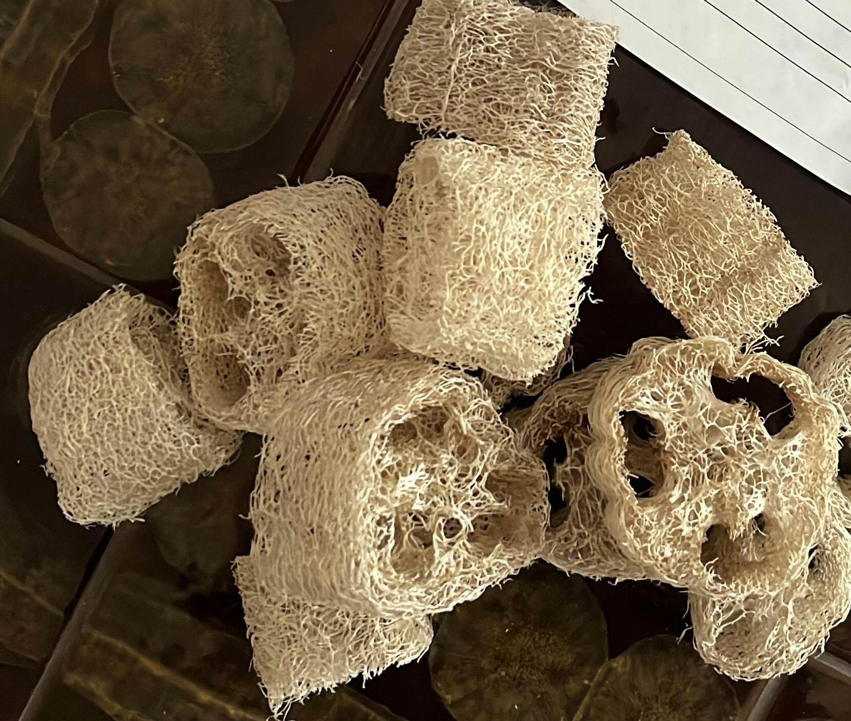 Our natural loofahs are grown on our farm here in central Alabama. They vary in shape, size, density, color, and texture. Our loofahs are unbleached to remain all-natural so they may have discoloration from off-white to brown.